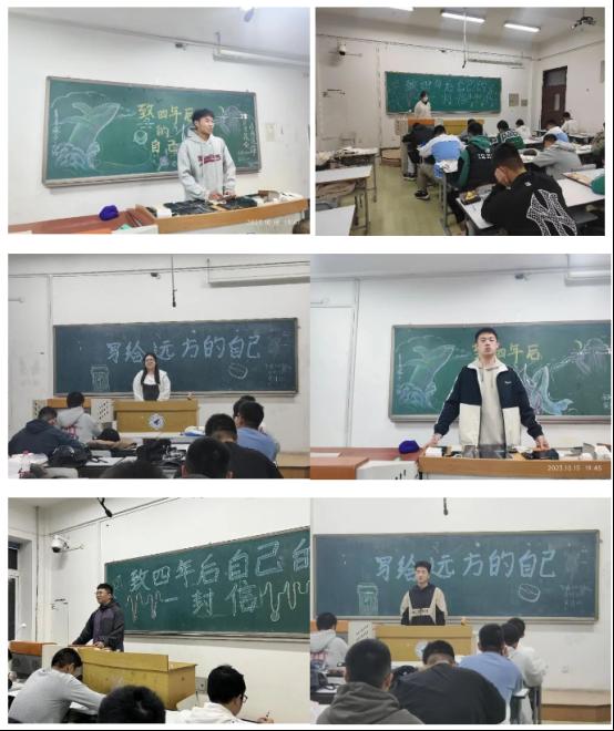 新生自己设计活动主题和板报,在听取辅导员助理对大学学习生活中美好解读后,大家纷纷拿出笔和纸,用心地构画着属于自己的未来四年大学生活。这些信现场被封存起来,由学院代为保管,信中内容也只有他们自己知道。相信,在那张纸上应该尽是希望,尽是美好,尽是感恩,尽是鼓励。青春的故事仍在继续,带着对未来生活的向往与期许,写下这封载着理想与追求的信,愿他们信中所写皆能如愿,前路漫漫亦灿灿!